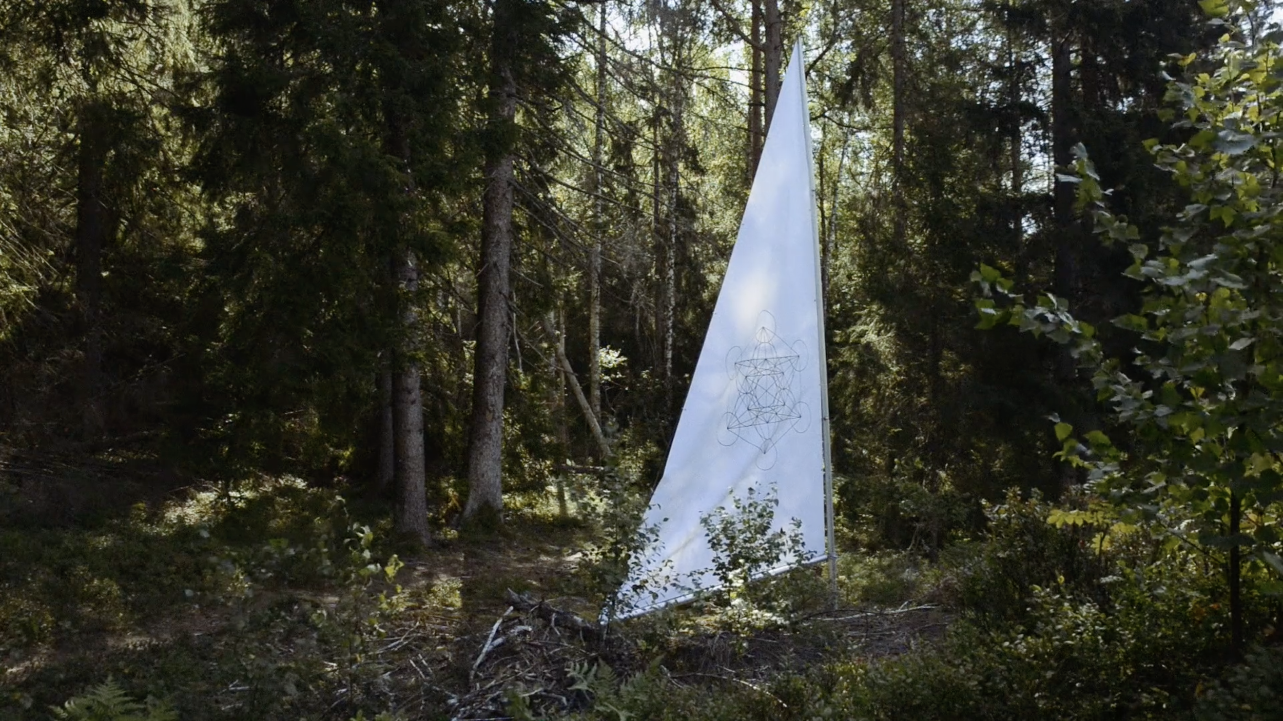 Geistlich, is a sculpture consisting of mast and sail. On the surface of the sail you will find a foilated geometric symbol called "Matatron's Cube". The sign can be traced back to antiquity, and has been used in various religions and cultures over large parts of the world. From Plato via Judaism and to the alternative movement. The forms represent wind, water, fire, earth, the universe, and are seen as a kind of "mother of all forms". The duo has chosen to call the work "Geistlich".