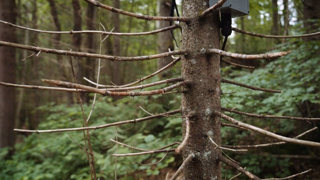 Three motorised hammers are mounted on three different trees standing close to each other. Each hammer is connected to a computer which in turn sends signals to strike on the trunks of the threes. This signal is triggered by three motion sensors which the audience activates when they move within a certain proximity to the sensors. The hammers are triggered individually and creates a random rhythmical pattern based on when and how the audience passes through this triangulation of threes and their sensors. The Installation is site specific.